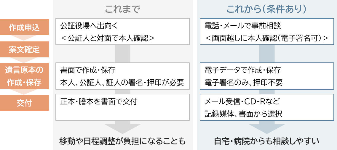 これまでは、公証役場へ行き対面で説明や確認を受ける必要がありましたが、高齢化や生活環境の変化により一定の条件を満たす場合には、電話やメール・ウェブ会議などを活用した確認方法が認められるようになりました。